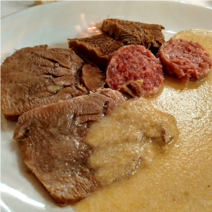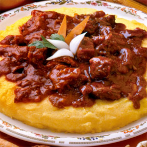 Piatto composto da carne di cavallo lasciata a macerare nel vino rosso e poi successivamente cotta a fuoco lento, accompagnato da un abbondante piatto di polenta