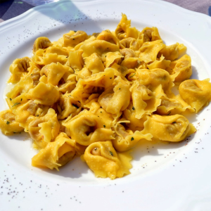 Tortellini fatti a mano con ripieno di brasato, comunemente gustati con burro e salvia o in brodo